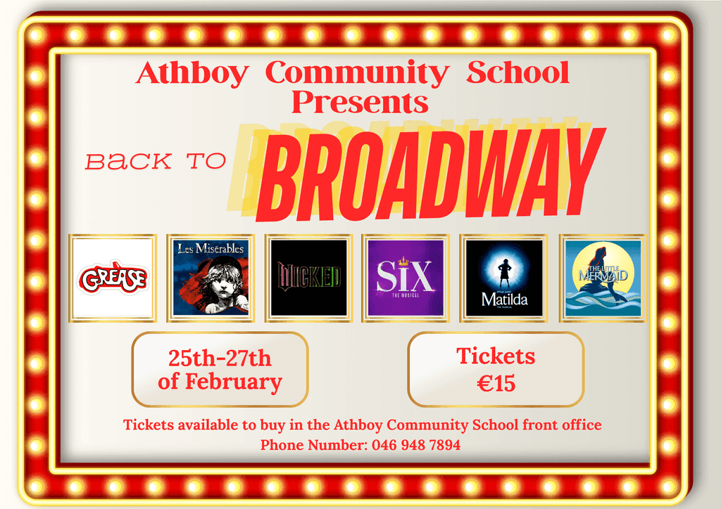Athboy C.S presents ‘Back to Broadway’, a medley of scenes from well-known musicals which runs in the school for three nights THIS WEEK from February 25th-27th. The last of the tickets cost just €15 and have been selling fast so to avoid disappointment, buy online or pick up from the front office, Ph. 046-9487894.