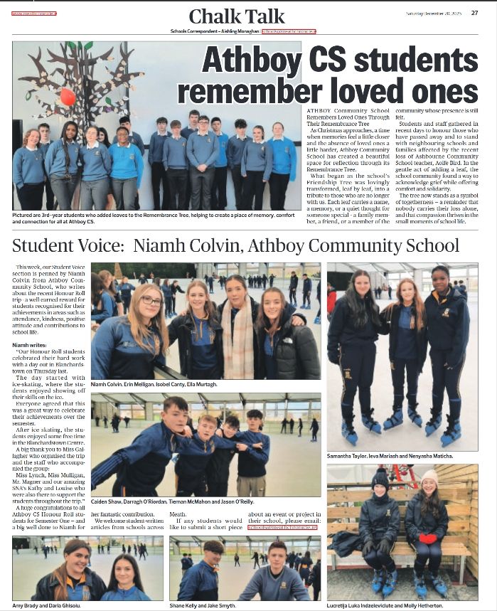 Athboy Community School once again feature prominently in this weeks Chalk Talk feature in the Meath Chronicle, compiled by journalist Aishling Monaghan. The paper is out now. It features an article on the school’s Remembrance tree co-ordinated by Miss Fitzsimons and the Honour Roll Ice-Skating trip co-ordinated by Miss Gallagher.