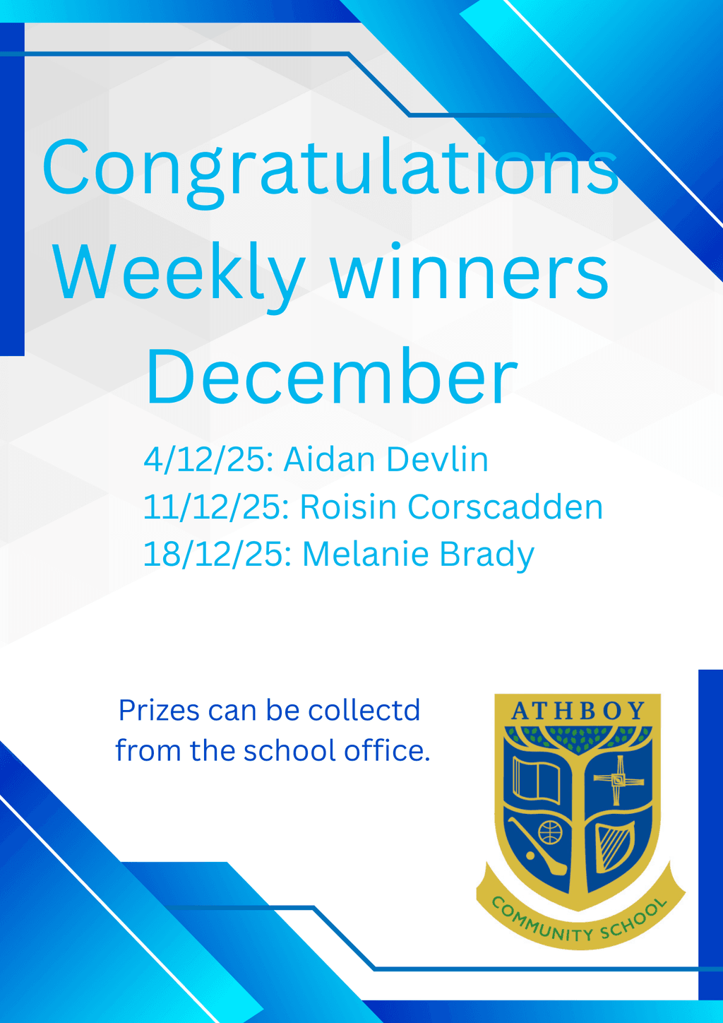 Congratulations to our Lotto winners for December, prizes may be collected from the school office. Thank you to all those who support the school’s Lotto.