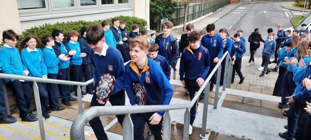 The u17 players were met off their bus at the steps of the school and given a guard of honour along with the u19 champions. The whole school community was there to meet them on the steps, in the GPA and on the landings above the stage.