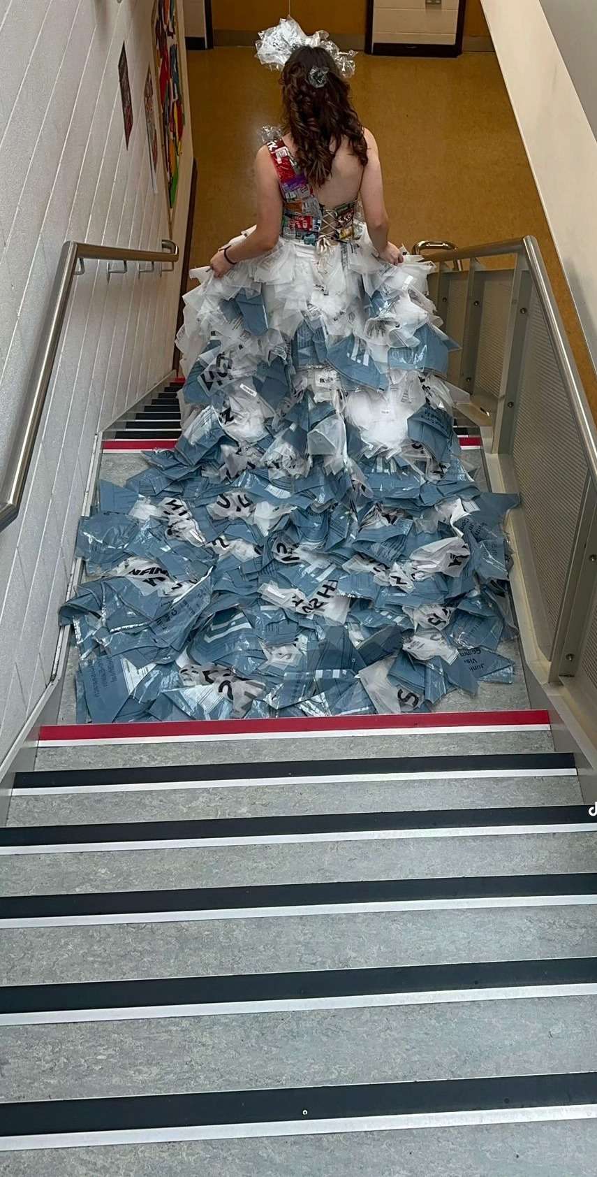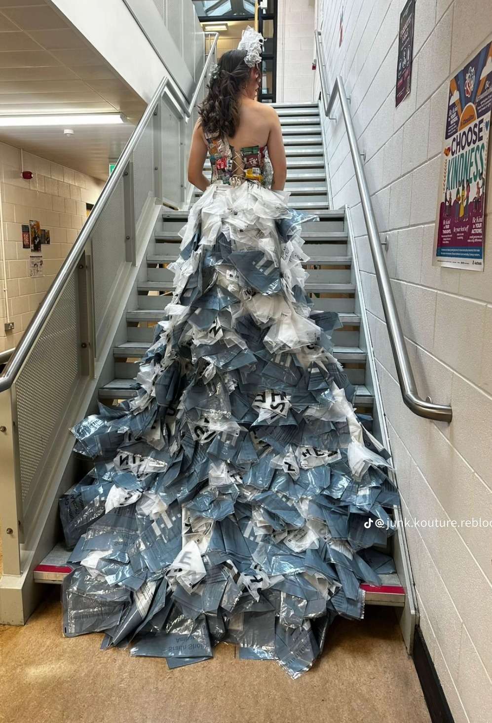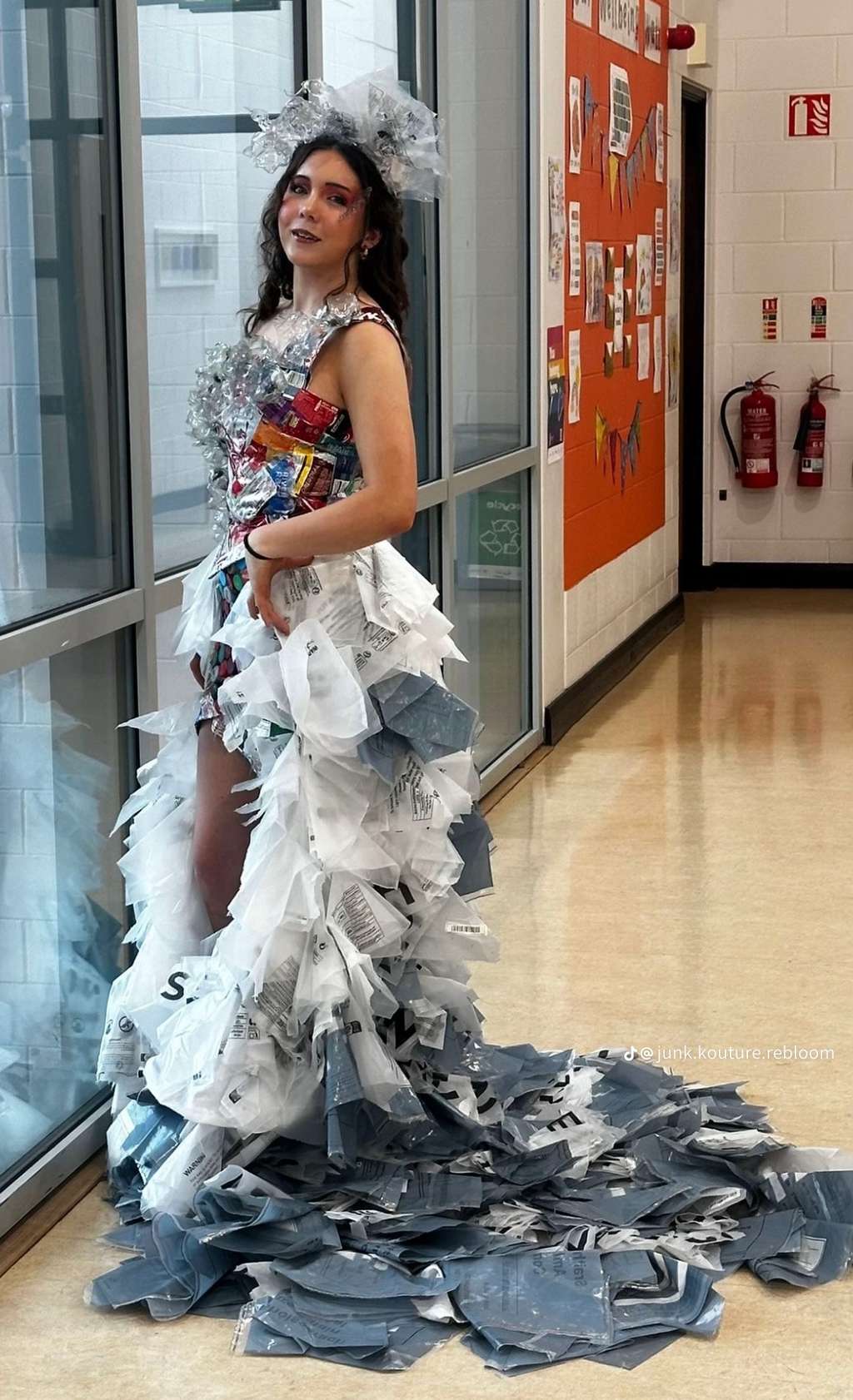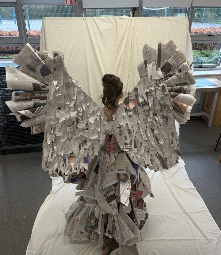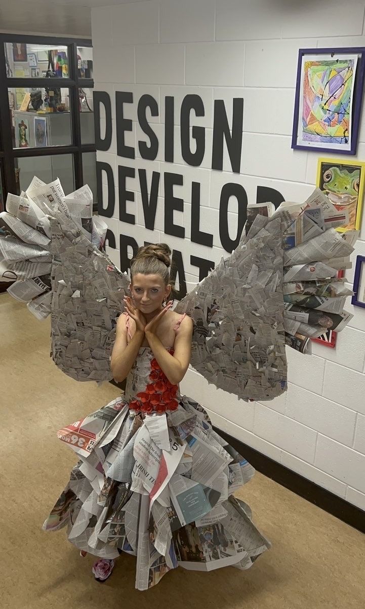 On Thursday January 22nd, the Junk Kouture groups had their competition photoshoot and video shoot. The Junk Kouture module was delivered to TY students by Mr Kington, Ms Monaghan, and Ms King with a total of eighteen students taking part this year. The global youth competition challenges secondary school students to design and create high-fashion couture from 100% recycled materials, promoting creativity, engineering, and sustainability by transforming everyday “junk” into wearable art for runway shows, fostering environmental awareness and circular economy thinking.   Group 1 (Savanagh Reilly, Isobel Canty and Erin Melligan) based their design around plastic in nature, naming their creation ‘ReBloom’, symbolising giving plastic a second chance. They wanted to portray what nature would like if plastic pollution continued the way it is going. They used materials such as Junior Certificate Art examination bags, plastic Shein bags and plastic bottles.   Group 2 (Isabelle O’Rourke, Daniela Ayezuwa and Helena Ni Fhearrchaidh) based their design on war, calling their creation ‘Wings of War’. They had features like poppy flowers made of egg cartons, wings made of cardboard and newspaper and a beautiful full skirt made solely out of newspaper.