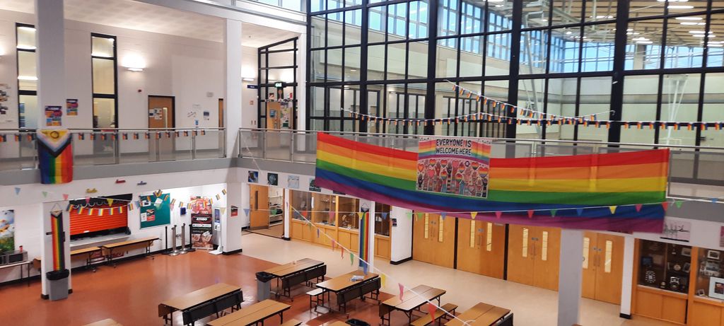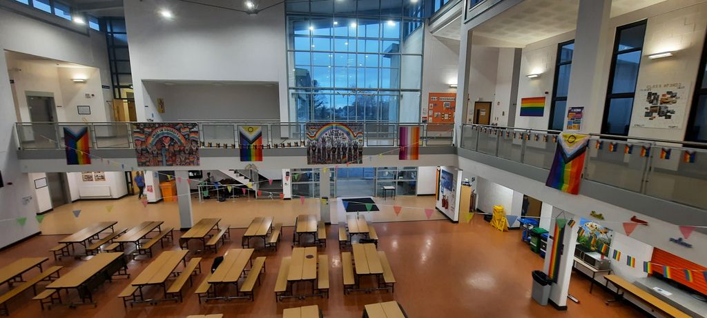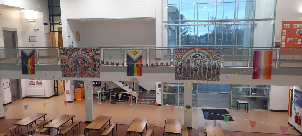 Thursday also saw a Colours Day where each Year Group was invited to wear a certain colour from the LGBTQ+ flag in solidarity with the LGBTQ+ community and to be an advocate for LGBTQ+ young people and champion change. 1st Years wore Red, 2nd Years donned Orange, 3rd years were in Yellow, Transition Years wore Green, 5th Years and LCA1’s were in blue and 6th years and LCA2 wore Purple. The school staff wore green or if they were a Tutor or Year Head some wore the same colour as their Class Group. There was a solidarity group photo taken at the end of lunch break.