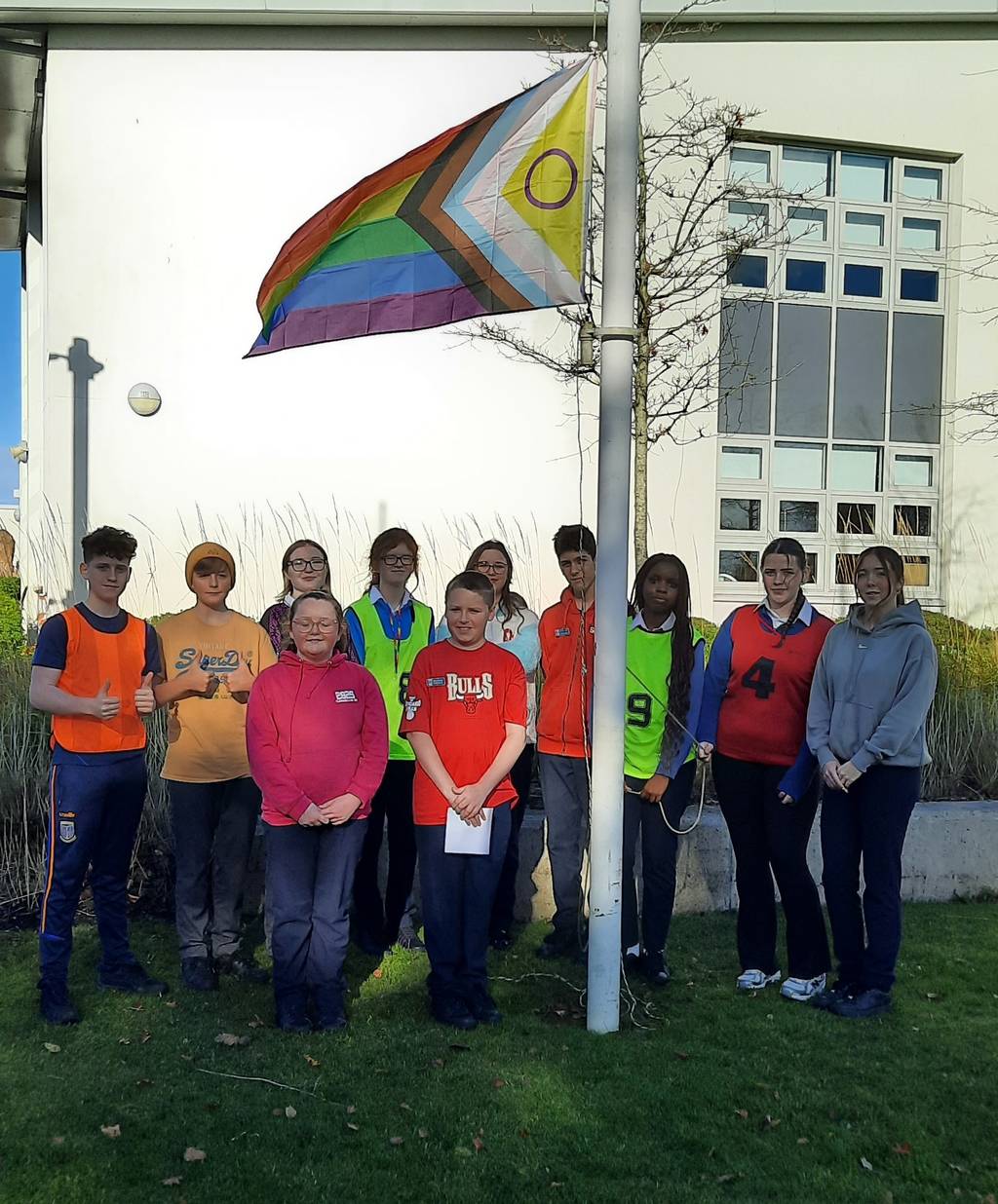 On Thursday there was a Flag-Raising Ceremony where members of the Student Council raised the LGBTQ+ flag on the flagpole outside the school. Student Council Class Rep, first year Aaron Flanagan, read out a commemorative speech as the flag was raised by other members of the Council, a speech he also broadcast over the school’s intercom later in the morning.