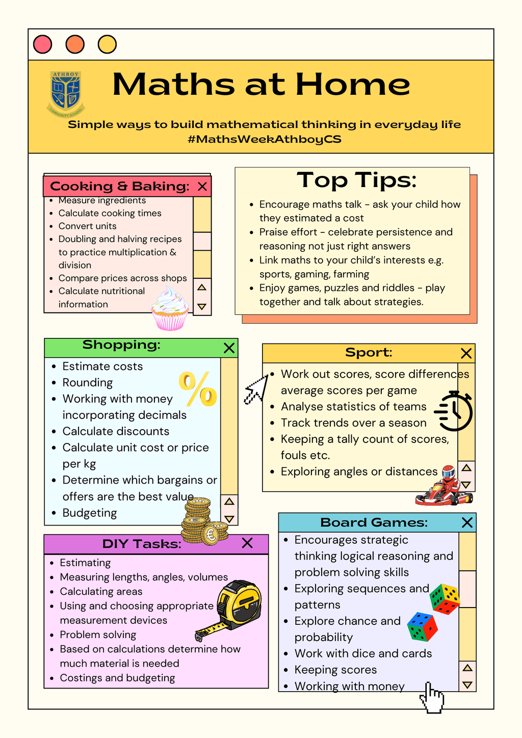 This week, we’re celebrating Maths Week Ireland — a national event that highlights the importance, creativity, and fun of maths in everyday life. In school we will have various events and opportunities for students to celebrate maths week. Throughout the week, we will also be sharing useful tips and advice on how you can support your child’s learning and confidence in maths at home.