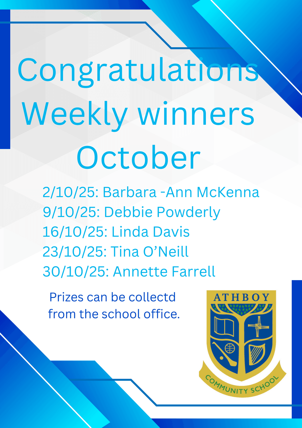 Our weekly winners for October. Congratulations to all winners and a massive thank you to those who continue to support our Lotto