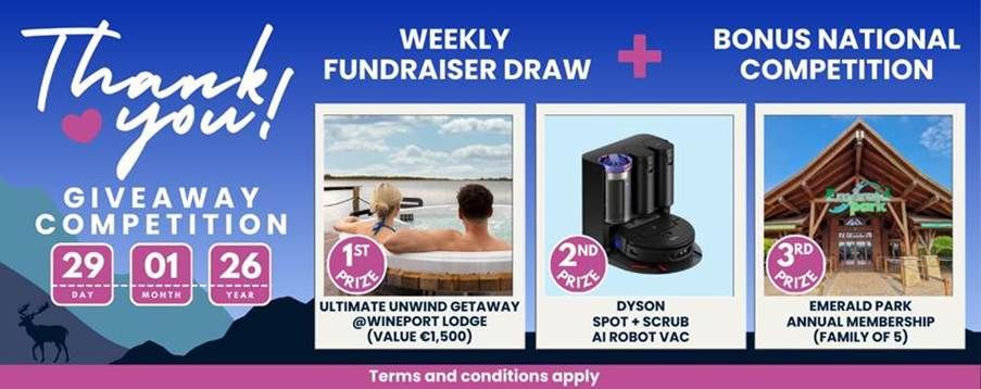 Some exciting news, every line in our fundraiser on Thursday 29th January 2026, has a chance to win our Jackpot and has a FREE chance to win one an exciting prize in a ‘Thank You’ Giveaway Competition. This nationwide competition is open to all supporters who have a ticket in a fundraiser run by our service provider ‘Our Fundraiser’ and the prizes include an Ultimate Unwind Getaway @Wineport Lodge (value €1,500), a Dyson Spot & Scrub AI Robot Vac and an Emerald Park Annual Membership (Family of 5).
