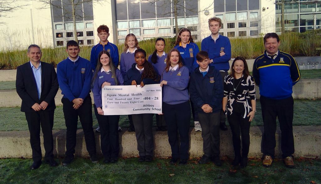 Brenda met with some members of the Student Council to outline the vital work Jigsaw does in supporting the mental health and wellbeing of young people across Ireland, and to thank the students of Athboy Community School for their fundraising efforts. She explained how Jigsaw provides free, confidential mental-health support for young people aged 12–25, as well as guidance and training for schools and families.